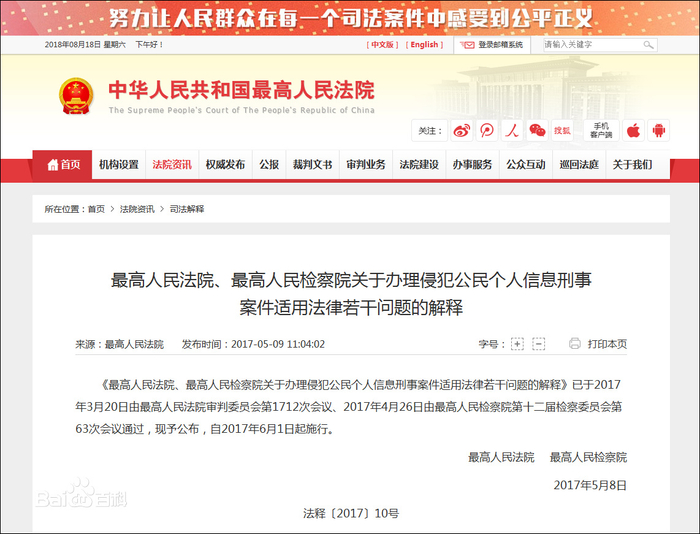 2017年5月9日,最高人民法院、最高人民检察院在北京联合发布《关于办理侵犯公民个人信息刑事案件适用法律若干问题的解释》(下称《解释》),首次对“人肉搜索”相关案件中非法泄露个人信息的行为如何定罪量刑作出解释。