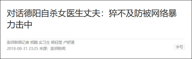 最后,用德阳自杀女医生的丈夫在接受媒体采访的话来作结束,“我们是网络暴力的受害者,在生活中的一个错误,经过了网络的暴力并叠加现实中的软暴力(到单位去闹),最终酿成了严重的后果。曾以为只是旁观者的我猝不及防地被击中,失去了最珍贵的东西。希望我们的悲剧不再重演。”