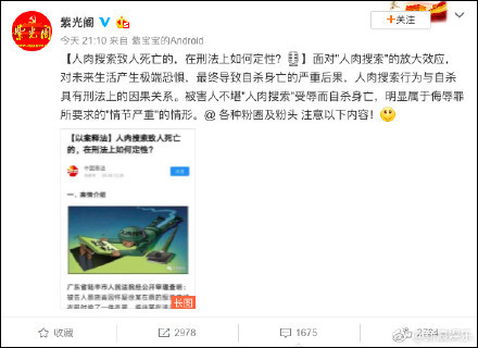 9月4日,@央视网、@共青团中央、@紫光阁等官方微博共同发声称,“拒绝网络暴力”、“人肉搜索违法”。