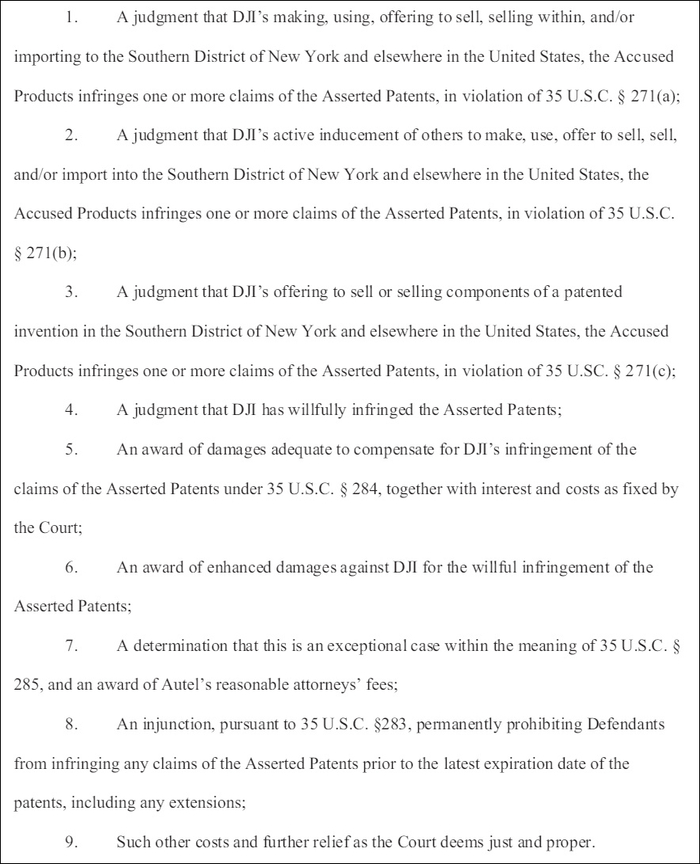 在起诉书中,“道通智能美国”请求法院确认大疆自身或“诱导他人”生产、使用、许诺销售、销售、进口被诉侵权产品及专利发明中的组件的行为“侵犯”且“故意侵犯”了其涉案专利,请求法院判给足以补偿大疆“侵权”造成损失的损害赔偿金及合理费用,以及“故意侵权”的惩罚性损害赔偿金。