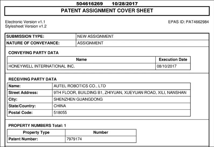 其中,174专利最初是由霍尼韦尔(Honeywell International Inc。)于2008年6月4日申请,直至2017年10月28日才转让至“道通智能航空”名下,2018年4月中旬又转让至“道通智能美国”名下。