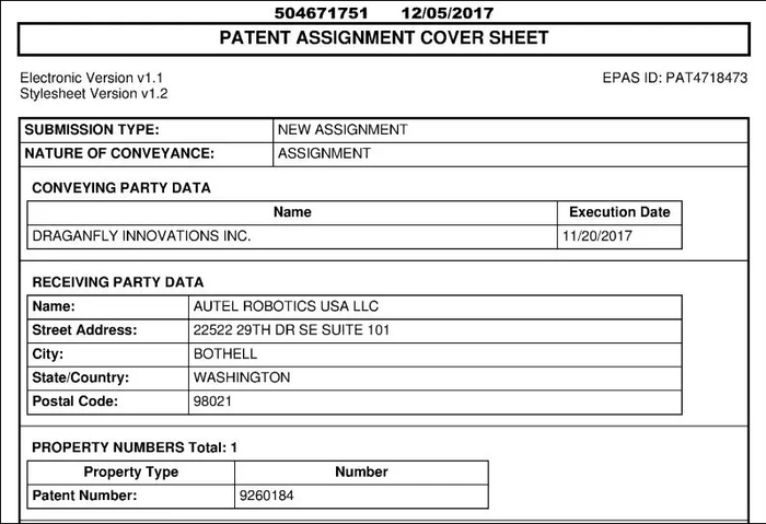 而184专利则是由加拿大渥太华一家名为“Draganfly Innovations Inc。”的无人机公司于2014年6月16日最初申请,于2017年12月5日方转让于“道通智能美国”。