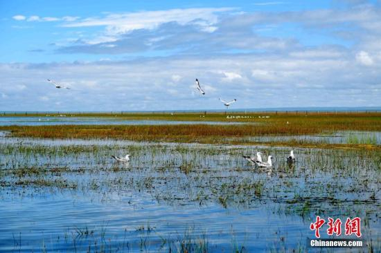 资料图:青海湖北岸的仙女湾湿地。 中新社记者 李隽 摄