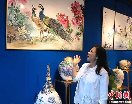 赵屏兰女士介绍将带去个展的国画和陶瓷作品。 中新社记者 邢利宇 摄