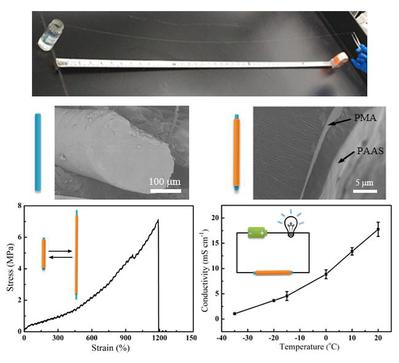 蜘蛛丝具有多层次的有序结构,从而表现出优异的力学性能。受蜘蛛丝的有序结构和纺丝方法的启发,中国科学技术大学马明明课题组通过凝胶纺丝的方法,实现了调控导电水凝胶中高分子链的排列和取向、制备出高性能导电水凝胶纤维的目标:在室温下由聚丙烯酸钠(PAAS)溶液直接纺丝得到水凝胶纤维,通过涂覆聚丙烯酸甲酯(PMA)防水层,形成具有核-壳结构的PMA-PAAS水凝胶纤维(MAPAH纤维)。在MAPAH纤维中,PAAS结晶区和非晶区共存并且可以快速可逆互变,使MAPAH纤维表现出优异的机械性能、导电性能以及抗冻性能。MAPAH纤维具有高拉伸强度(5.6 MPa)和大断裂伸长率(1200%),并且可以在大幅度拉伸后快速回复。PAAS水凝胶作为导电芯(电导率为2 S m-1),PMA层作为防水和绝缘涂层,使MAPAH纤维可以作为具有高可拉伸性的弹性导线。MAPAH纤维在-350C也能保持其可拉伸性和导电性,表现出优异的抗冻性能。作为一种高性能和低成本的弹性可拉伸导电水凝胶纤维,MAPAH纤维将可用于开发基于纺织材料的可拉伸电子器件。