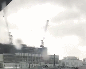 原本在施工还没来得及撤下的吊架这会儿也随着狂风,唱起了“一起摇摆”……