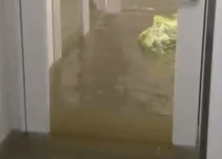 走进房间一看,不光是水漫金山,房间玻璃爆裂后,所有东西都被吹得乱七八糟,挂墙空调半吊在空中还在垂死挣扎。