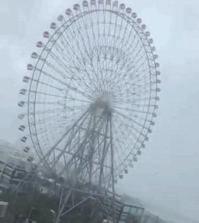 有网友还拍到大阪的天宝山摩天轮在狂风中变成了“大风车”,这个高112.5米,直径100米的大家伙原本转一圈需要17分钟,可是现在转一圈却只需要20秒……