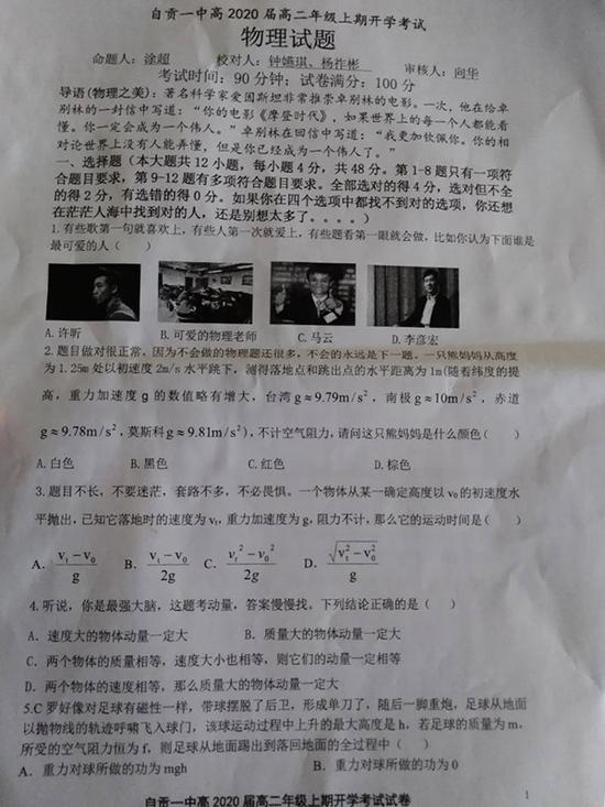 网上流传的这张试卷为《自贡一中高2020届高二年级上期开学考试物理试题》,命题人涂超,考试时间90分钟,满分100分。试卷共18道题,分选择、实验、计算三个题型。几乎每道题前,命题人都会加上一个“段子”,有爱因斯坦和卓别林的故事,有各种网络笑话,也有鼓励学生努力学习的语句。网友评论称,这些句子不但有趣,还和知识点结合在一起。