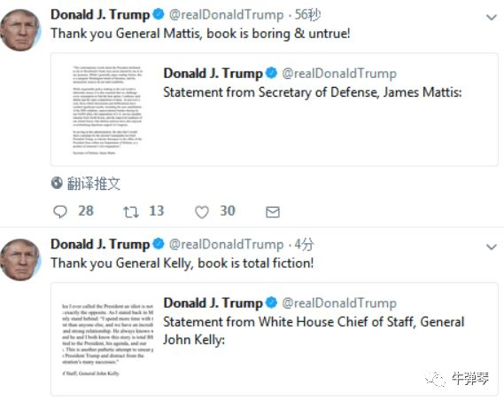 特朗普立刻转发了他们的声明。比如,他转发马蒂斯的声明说:谢谢马蒂斯将军,这本书太无聊太虚假。