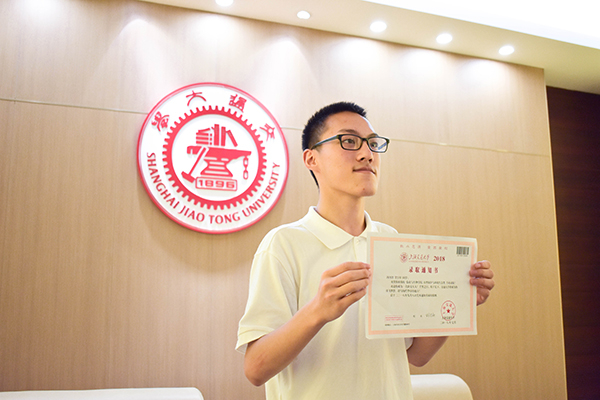 开学当天,在霍英东体育馆一楼接待室内,男生贺宇轩身着白色上衣、戴着黑框眼镜,身材瘦削,站得笔直,他是上海交通大学农业与生物学院的2018级大一新生。