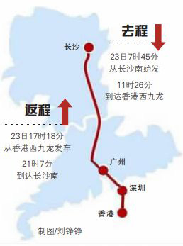 据长沙南站介绍,我省首趟始发直达香港高铁车次为G6113/G6114往返列车。去程23日7时45分从长沙南始发,11时26分到达香港西九龙;返程23日17时18分从香港西九龙发车,21时7分到达长沙南。