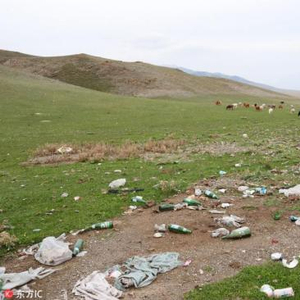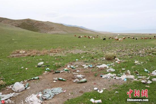新疆赛里木湖边牛羊成群 游客丢下成堆垃圾大煞风景。 方行 摄 图片来源:东方IC