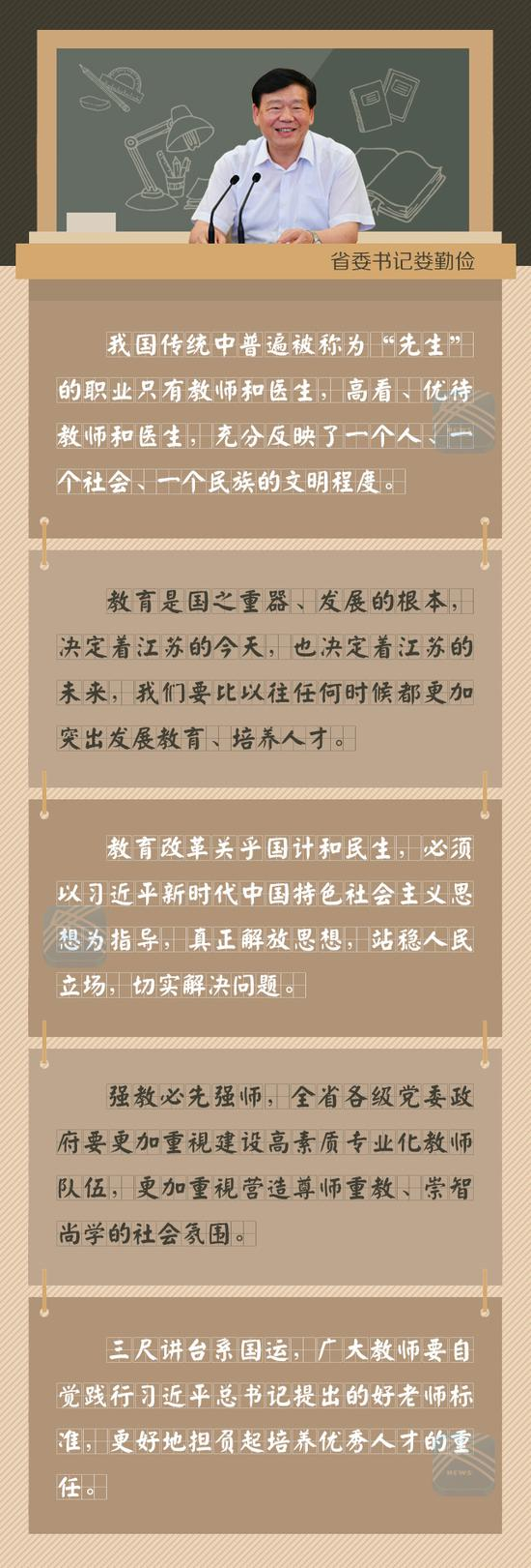娄勤俭指出,强教必先强师,全省各级党委政府要更加重视建设高素质专业化教师队伍,更加重视营造尊师重教、崇智尚学的社会氛围。要把教育事业摆在更加突出的位置,多措并举提升教师素质、优化师资结构,建设一支师德高尚、业务精湛、结构合理、充满活力的教师队伍,满足一流教育发展需求。要切实解决广大教师思想、工作和生活中的实际困难与问题,改善教师待遇,关心教师健康,完善社会保障措施,维护教师合法权益,强化人文关怀和组织关爱,不断增强广大教师的职业幸福感、成就感和荣誉感。要充分调动广大教师立德树人、教书育人的积极性主动性创造性,大张旗鼓地宣传优秀教师的先进事迹,在全社会形成尊师重教、尊重知识的浓厚氛围。