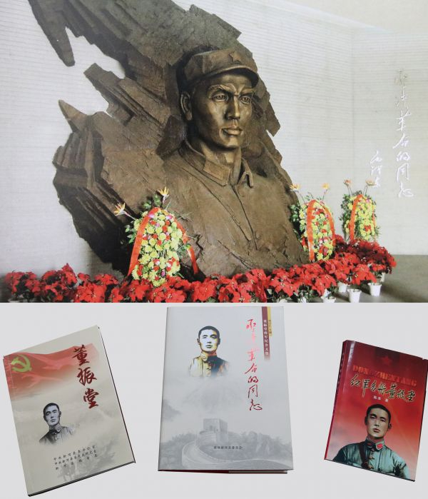 图四:新河县积极挖掘红色文化资源,打造红色教育基地。上图为董振堂事迹陈列馆前厅将军塑像和纪念红军将领董振堂的系列书籍;下图为革命烈士吴子林纪念碑亭。