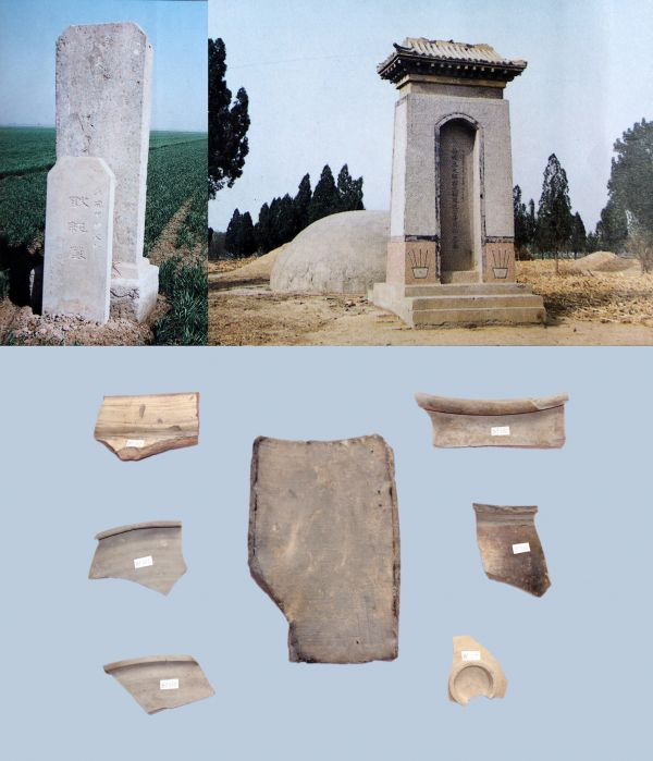 图一:西周烽燧台遗址瓦片(下)、东汉名将耿纯墓(左上)、元脱脱丞相公子周彬墓(右上)。