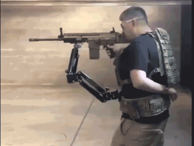 美军士兵单手测试“第三臂”辅助臂开枪动态图。