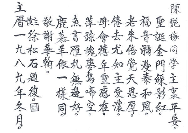 陈艳梅:我们一直保持着通讯关系。从他离开大陆到香港,再到美国。他在美国一门心思做传道人,做牧师。不仅在美国,他还到香港、台湾地区去循环布道。我哥也知道,说徐松石到台湾去过的。我们1952年毕业,一直到1988年跟我哥开始联系。我们分别了38年,一直没有信息。哥哥在香港公司里做职员,因为哥哥外文比较好,所以做文书来往处理等工作。他在橡胶大王王永庆的公司里面,也做过对外的文书处理工作。1988年,哥哥回来后,因为他知道徐松石是我们的校长,他有徐松石的地址,就把地址给我,我就和徐校长联系上了。我当时就在想,这么多学生徐校长不知道还记得我吗?结果他记得我,而且回信给我,我很感动。徐校长是1989年开始和我联系的,我退休之后也和他保持着联系。每年圣诞节,我们都会写信,讲讲我们一年的情况,也会互寄贺卡,这张是1989年冬月的。