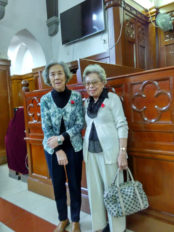 2015年10月18日,张月嫦和陈艳梅摄于参加基督教新恩堂粤语聚会的敬老节礼拜。