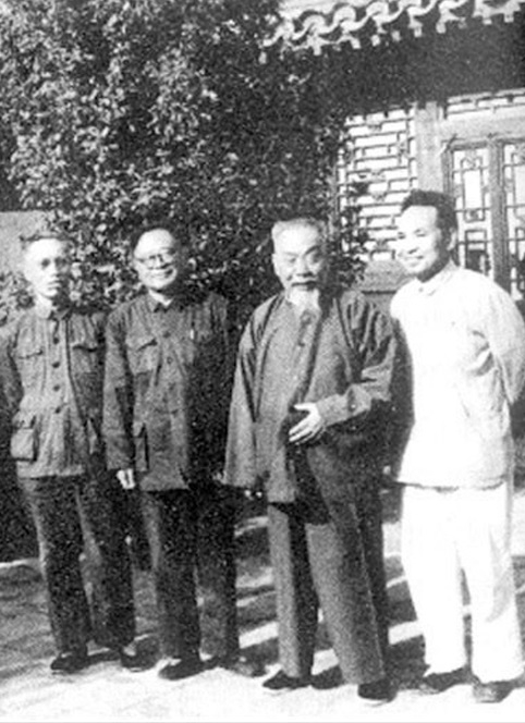 1959年5月1日,金灿然(右一)与陈乃乾(右三)、潘达人(右四)一同前往拜访陈垣(右二)