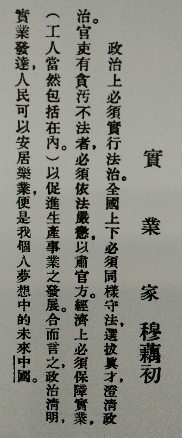 作为近代中国叱咤风云的民族实业家,穆藕初具有远大抱负和强烈的社会责任感。1933年元旦出版的《东方杂志》上,时年58岁的穆藕初曾发表他的新年梦想:“政治上必须实行法治,全国上下必须同样守法,选拔真才,澄清政治,官吏有贪污不法者,必须依法严惩,以肃官方。经济上必须保障实业(工人当然包括在内),以促进生产事业之发展。合而言之,政治清明,实业发达,人民可以安居乐业,便是我个人梦想中的未来中国。”“在事业上可以按照计划逐步推广,以造福于平民生计。在生活上可以稍有余暇,继续研究一种专门学问。尤希望在职业以外,能有余力为社会服务,为大众谋幸福。”(“新年的梦想”,《东方杂志》第三十卷第一号,1933年1月1日。)可见,作为成功卓著的实业家,穆藕初对国家与社会,对个人与大众,都有着美好的热盼期许和深沉的家国情怀。