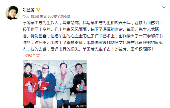 与单田芳、田连元、袁阔成并称为“当今评书四大家”的刘兰芳在微博上悼念称,“惊闻单田芳先生做古,异常悲痛。我与单田芳先生相识六十年,在鞍山曲艺团一起工作三十多年。几十年来风风雨雨,结下了深厚的友谊。单田芳先生艺术精湛、特别勤奋,他把毕生的心血全用在了评书艺术上,创作播出了一百余部评书作品,对评书艺术做出了卓越贡献,也是国家级非物质文化遗产北京评书的传承人。他的去世,是评书界的损失。单田芳先生千古!刘兰芳、王印权缅怀!”