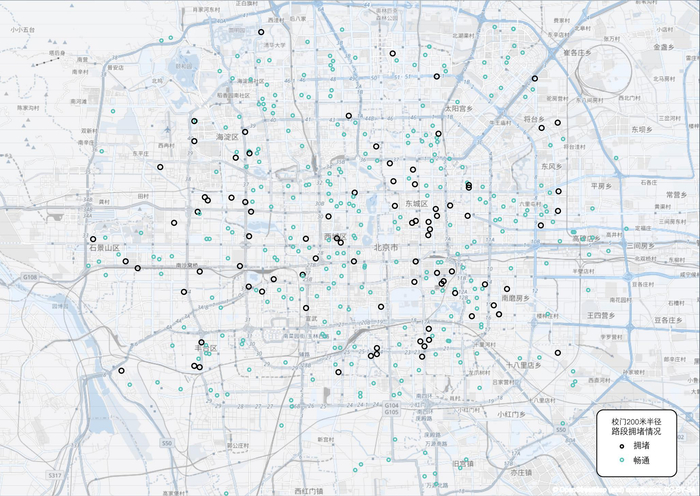 北京中小学校门半径200米内路段拥堵情况,黑色圆圈拥堵,蓝色表示畅通。