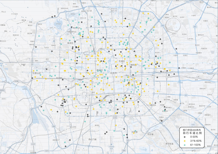 北京中小学校门半径400米内自行车道比例,黑色圆圈表示0-30%,黄色圆圈表示31%-60%,蓝色表示61%-100% 。