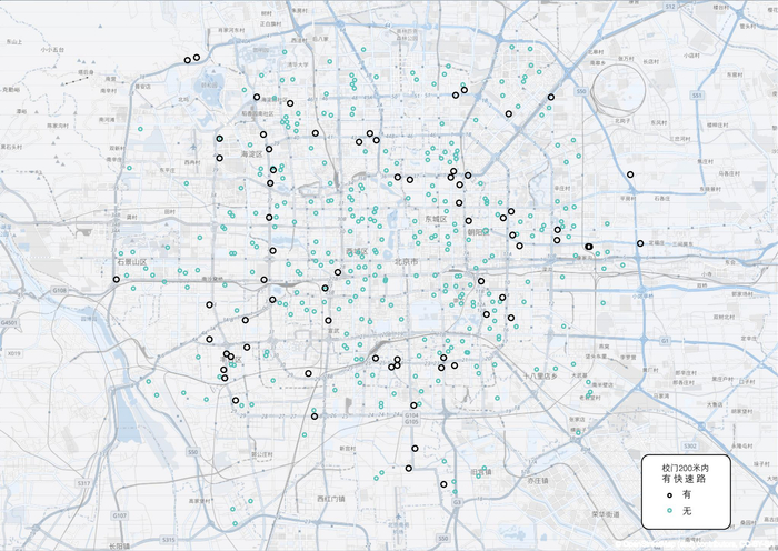 北京中小学校门口200米内是否有快速路,黑色圆圈表示有,蓝色表示无。