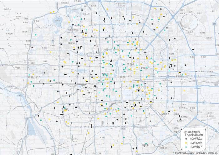 可以明显看到,二环以外,大部分学校周边安全过街距离都在800米以上,这意味着,小学生在校门外至少要走上15分钟、中学生走上10分钟才有安全过街设施。否则,学生们只能在车流中穿行,或者绕远路。