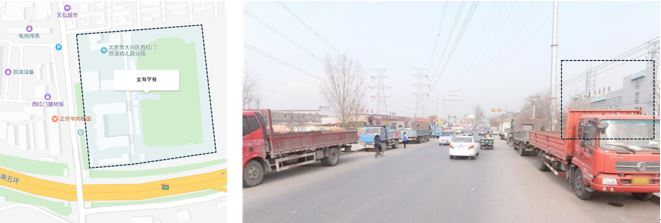 金海学校毗邻南五环,校门距离西红门建材城仅100余米。加上周围物流园和工厂较多,周围来往大货车很多,安全隐患较大。