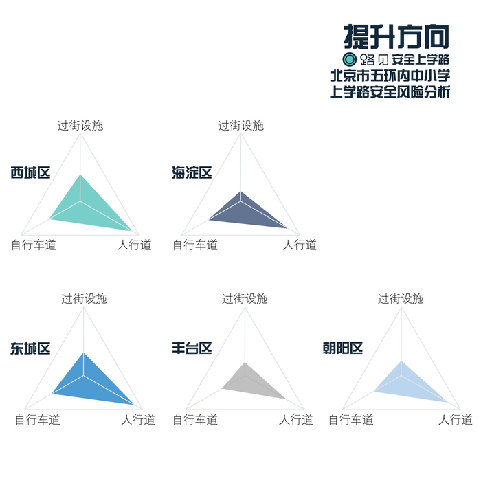 我们试图从大数据的角度总结出各区的特点与改善方向。可以发现,邻近交叉口、缺少过街设施、缺少自行车道是普遍存在的问题。考虑到学校很可能难以改变校门口位置,也很难缓解周边道路拥堵情况,我们又对其他三项指标进行了比较。