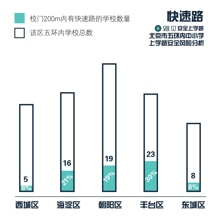 快速路包括高速以及北京的二环、三环、四环、五环等等。尽管有的学校出入口未直接设置在快速路边,而是在辅路或地块内部的道路上,但200米的步行距离也不足以使孩子完全规避路况复杂、交通秩序混乱、高速行驶的机动车带来的危险。