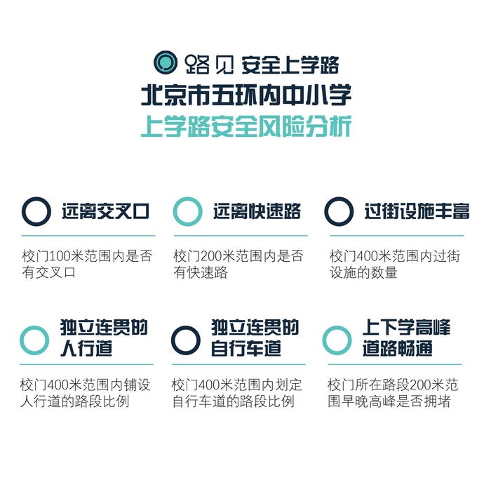 为了研究中国中小学生的上学路安全问题,路见团队以北京为例,通过大数据手段,对北京五环内的221所小学,170所中学进行了分析,得到了六个主要发现: