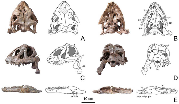 图3 孙氏彝州龙的头骨照片及骨骼成份线条图。(张茜楠供图,骨骼照片为高伟拍摄)