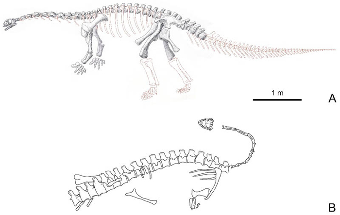 图2 孙氏彝州龙的骨骼复原图(A)及原始埋藏示意图(B)。(张茜楠供图,骨骼复原图为郭肖聪绘制)
