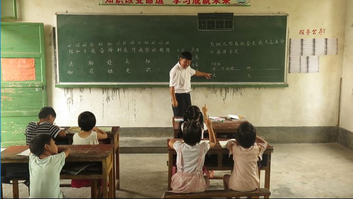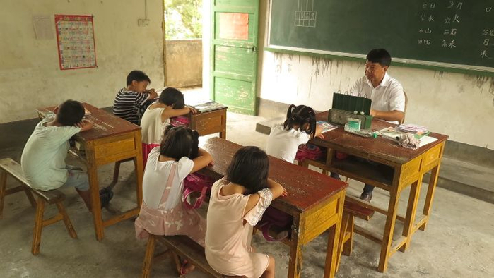 由于现在只有谢发桂一个老师,学校的两个年级是合班进行教学的。每天七节课,包括数学、语文、体育、美术、写字、阅读,所有课程都是谢发桂一个人承担。每节课40分钟,谢发桂前20分钟给一年级的上课,上完后让一年级的学生做作业,然后又给二年级的学生上课。每天谢发桂都要在讲台上站上5、6个小时,实在站的累了才坐下休息几分钟。