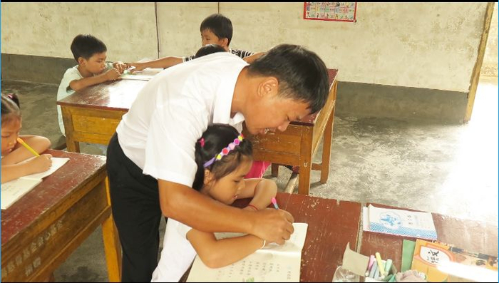 谢发桂今年50岁,自1989年瑞金师范毕业以来就一直在边远山区任教,到现在已经整整三十年。2008年,谢发桂调入赣信民族希望小学,这是会昌县筠门岭镇一个偏远的山区教学点,由于地处偏远,许多教师在这里呆了不久就要想办法调走,现在只有谢发桂依旧坚守。谢发桂刚到赣信民族希望小学工作的时候学校还有8位老师、138个学生、4个年级,后来慢慢的老师离开了,学生也减少了,现在就只剩下谢发桂一个老师和2个年级共 6个学生。 谢发桂正在教孩子们写字