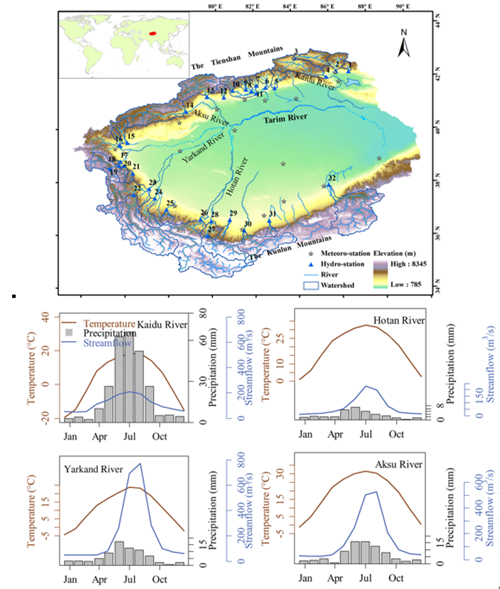 图1 塔里木河流域32个内陆子流域的位置与水系图。另外,塔河四源流开都河、和田河、叶尔羌河和阿克苏河的气温、降水和流量的年内分布也分别给出