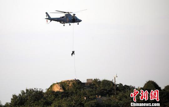 图为警方出动直升机索降无人岛抓获走私者。 泱波 摄