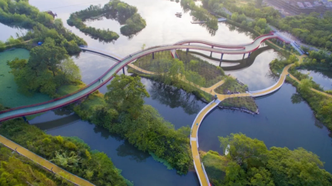 设计团队介绍,将分段处理不同主题的高线公园,形成二层人行架空步道,步行路线与胜家海和张公堤对接,确保行人和骑行者轻松到达新城的各个区域,“还能给行人不一样的景观体验”。