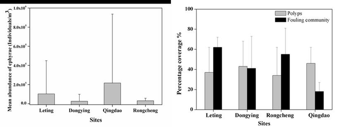 中国科学院烟台海岸带研究所近海环境生态学与生境调控团队,通过4年多的野外综合调查,发现黄渤海滨海养殖池暴发的“红水母”灾害为海月水母碟状幼体所致(图1),且“红水母”普遍存在于黄渤海沿岸海参养殖池,平均出现率为40.2%,平均丰度为0.94×105 individuals/m3,最高丰度达5.70×106 individuals/m3(图2)。通过潜水调查,进一步追踪确认了黄渤海沿岸海参养殖池爆发的“红水母”源头,发现海参人工礁(包括瓦片、海参笼、水下遮阳网等)为海月水母螅状幼体提供了大量的人工附着基(图3;Dong et al., 2018, Hydrobiolgia)。此外,海岸带人工修建物附着的入侵种针盘管虫(Hydroides dianthus)形成的生物礁,也为海月水母螅状幼体提供了大量栖息地(图3;Dong et al., 2018, Marine Pollution Bulletin)。上述研究结果提供了海岸带人工构建物增多为海月水母提供附着基的新证据,也为现场原位开展海月水母灾害早期发生及调控机制研究奠定了基础。