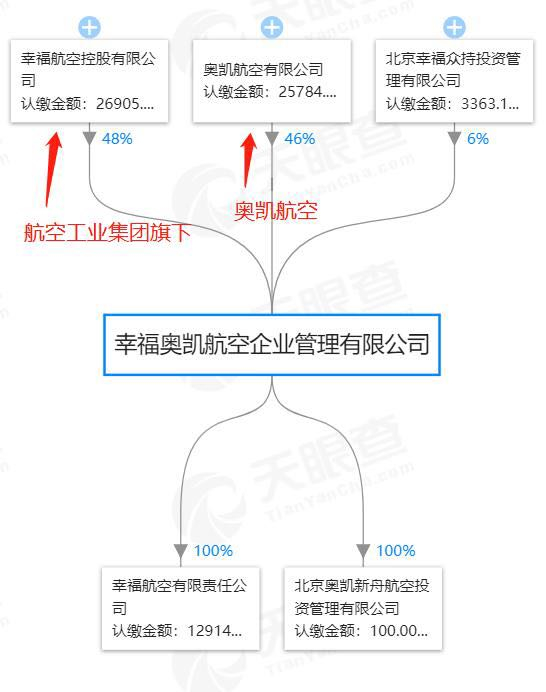 幸福奥凯目前由幸福航空控股有限公司、奥凯航空有限公司、北京幸福众持投资管理有限公司三方出资,三家分别持有48%,46%和6%的股份。