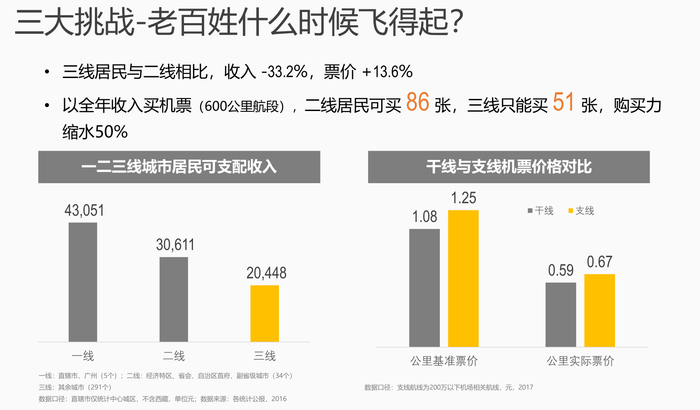 林智杰进一步分析,支线航空赚不了钱,与市场需求跟不上和支线票价定价高不无关系。在我国,铁路是非常重要的运输方式,支线的飞行距离更易受到铁路的直接冲击,此外,支线比干线公里票价贵得多,我比如国最繁忙的商务干线北京-上海,基准运价是1.1元/公里,而著名的旅游支线昆明-西双版纳航线,基准运价是3.2元/公里,大约是北京-上海的3倍,而支线主要运营的三线城市消费水平却有限,三线城市居民收入不到一线城市的一半,机票价格却反而高出13%,供需矛盾可想而知。