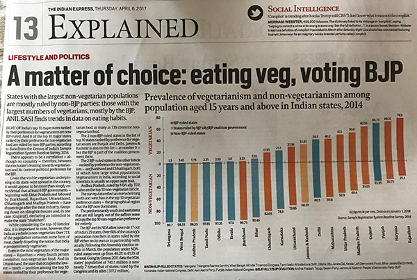 执政的人民党极力鼓吹素食主义,不外乎是要体现其印度教本色,以迎合其背后的“国民志愿服务团”和占这个国家人口多数印度教信徒。2017年公布的一项调查表明,素食者居多的10个邦,都是印度教民族主义的人民党在“掌权”;而10个非素食者居多的邦中,有8个都是其他党“掌权”。这篇刊登在《印度快报》(2017年4月6日)上的文章,标题就明确地写着《吃素食者,投人民党的票》。