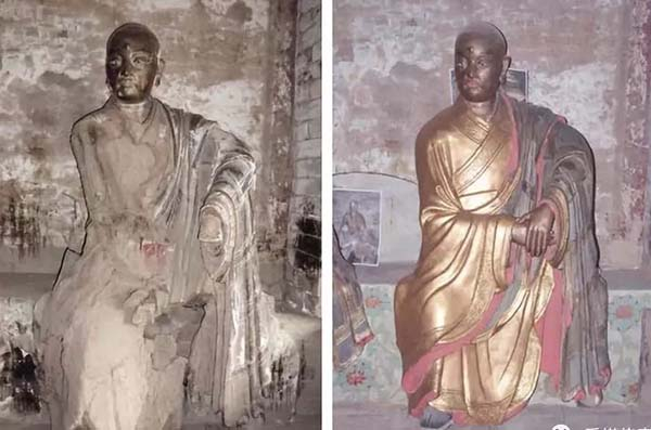 青莲寺罗汉堂尊者彩塑修缮前后对比。 陕西文保图