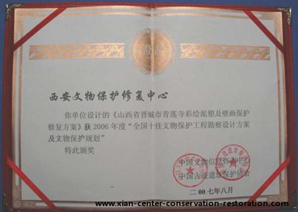 《青莲寺彩绘泥塑及壁画保护修复方案》奖状