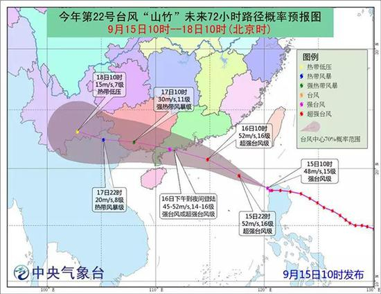 上述消息称,预计“山竹”即将于15日中午前后进入南海东部海面,并将于16日下午到夜间在广东台山到徐闻一带沿海登陆(14~16级,45~52米/秒,强台风级或超强台风级),之后继续向西偏北方向移动,强度逐渐减弱。中央气象台15日6时继续发布台风橙色预警。