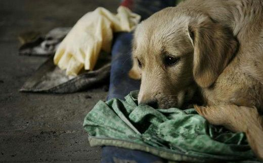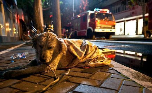 上海火灾现场,守望犬晶晶不吃不喝留着眼泪等待主人的出现。直到主人来到了消防中队,晶晶立即跳起来,奔向主人,吃下了40个小时的第一口食物。消防队员感慨:“一看就知道这是主人来了”。