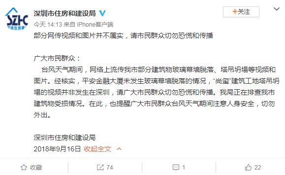 9月16日,深圳市住房和建设局官方微博@深圳市住房和建设局发布声明称,台风天气期间,网络上流传我市部分建筑物玻璃幕墙脱落、塔吊坍塌等视频和图片。经核实,平安金融大厦未发生玻璃幕墙脱落的情况,“尚玺”建筑工地塔吊坍塌的视频并非发生在深圳,请广大市民群众切勿恐慌和传播。